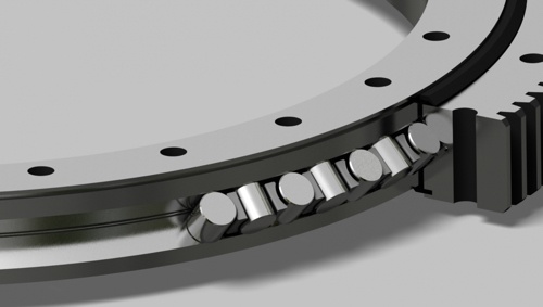 為了實(shí)現(xiàn)這種通用的承載能力,11系列回轉(zhuǎn)支承采用V型槽滾道,每個(gè)環(huán)中都有兩個(gè)滾柱。滾柱的長(zhǎng)度略小于直徑,并且定位在環(huán)之間,使得相鄰的滾柱彼此成直角并接觸相對(duì)的一組滾道。這種交叉滾柱的形式是一半的滾柱在一個(gè)方向上傳遞負(fù)載而另一半傳遞負(fù)載在另一個(gè)方向。滾柱通常由單獨(dú)的隔離快分開,這些隔離快占據(jù)最小的空間,允許使用幾乎完整的滾輪。
